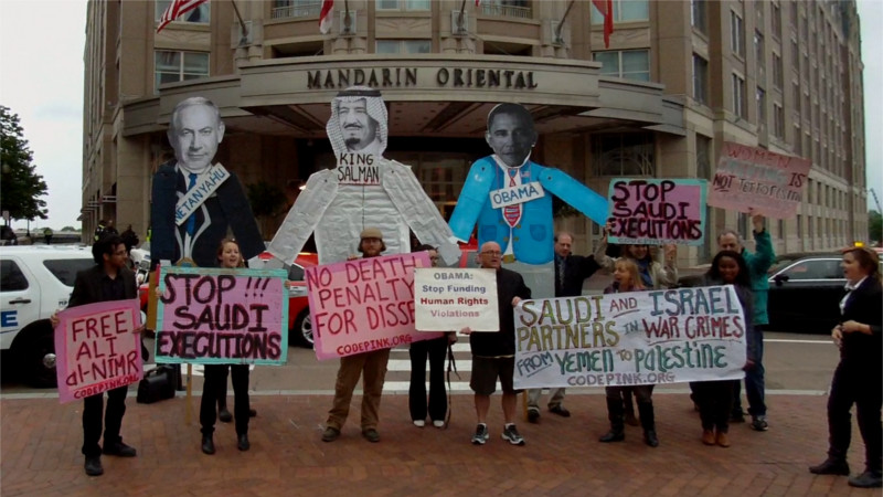 On the 5th of May, high-level Saudi and Israeli officials met at the so-called "Mandarin Oriental" hotel in SW DC. Code Pink got a team inside before they were escorted back out. Code Pink then set up a noisy "teach-in" protest outside. Everyone in earshot heard about how both the Saudis and Israelis are among the worst human rights violators and sponsors of war in the entire Middle East. The Saudis were also called out for beheading people just like Daesh(ISIS) does and for planning to behead and crucify young Ali Nimr because his uncle was a (recently beheaded) prominant Shiite cleric. Saudi Arabia and Israel are both famous for being states founded on religion, also much like Daesh.
