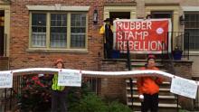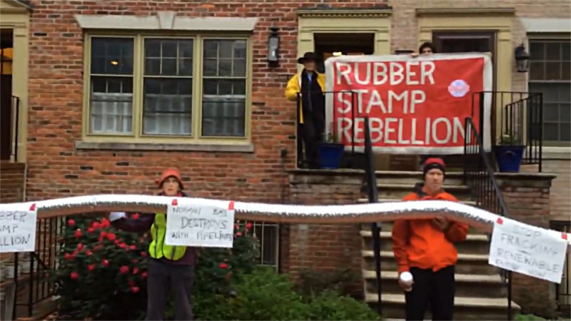On the 16th of May, the Rubber Stamp Rebellion began with an 8AM blockade and noisefest outside the offices of FERC, the Federal Energy Regulatory Commission. This was followed by a PM rush hour "pipeline" blockade stopping all traffic out of FERC's driveway. That night, FERC Commissioner Tony Clark got home only to find protesters were there too. FERC is notorious for rubberstamping almost all permits for oil and gas fracking and pipelines. They are also the source of eminent domain authority for these projects.