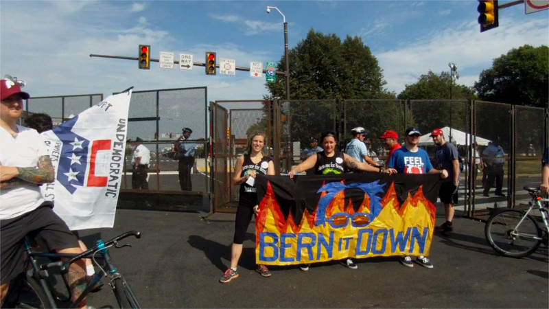 Sanders supporters with "Bern it Down" banner after march from City Hall to the fortified DNC site