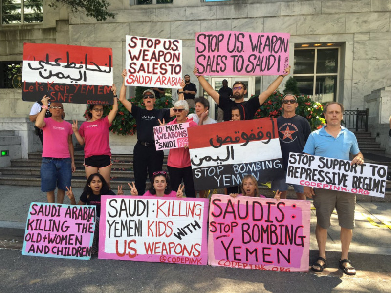 On the 23ed of August, Code Pink blockaded the front entrance of the Embassy of Saudi Arabia to demand they stop their bombing campaign in Yemen. Saudi Arabia's terror bombing there differs from what Daesh does mostly in the use of aircraft to deliver the bombs-and in that fact that the bombs are supplied by the United States.The sectarian nature of Saudi Arabia's intervention in Yemen is essentially the same as that seen elsewhere from Daesh.
