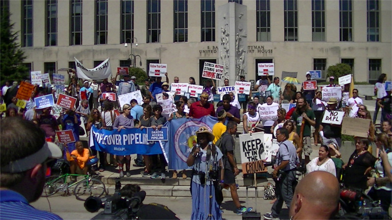 On the 24th of August, US District Court at 333 Constitution Ave heard the Standing Rock Sioux Tribe's lawsuit against the US Army Corps of Engineers over the Dakota Access Pipeline. Outside hundreds protested as speakers alternated with drumming and singing. As this case was being heard, construction at the site where protesters are blocking the pipeline in North Dakota has been halted pending resolution of this and several other legal cases. Dozens have been arrested there, but a hearing set (in another case)for August 25 on an injunction to limit protest and direct action at the pipeline site was cancelled in light of the construction halt.