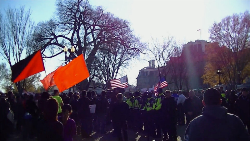 On the 3rd of December, neo-Nazis attempted to march to Lafayette Park in front of the White House for a rally with speakers. They ran into stiff opposition as two different groups opposing fascism marched onto Pennsylvania Ave to confront them. The advance of the Nazis then stalled, and this was as far as they got. A large number of cops then blocked the road and pushed into the space between the Nazis and the much greater number of counterprotesters.