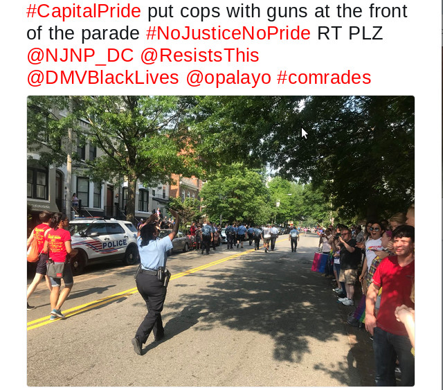 The official list of contingents in the 2018 Capitol Pride parade did not include MPD, and there was a long time with nothing on the route before another, different contingent appeared to step off the parade. None the less, David Thurston got a photo of MPD officers escorted by two Pride staffers marching the route, possibly well ahead of the rest of the parade