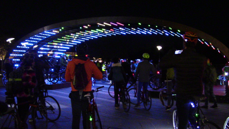 On the 11th of December, the last DC Bike Party of the year took to the streets. After an uphill run via Mass Ave and some side streets to Wisconsin Ave, the ride stopped at "Light Battle" at Georgetown Glow. This artwork features two teams of stationary bikes and an arch of pulsing LED lights.