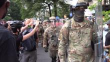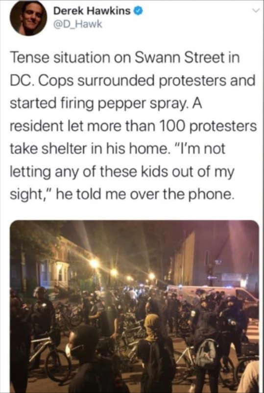 Update late night: video on Twitter of cops or troops firing pepper spray, another video shows cops firing rubber bullets first, water bottles thrown in RESPONSE.