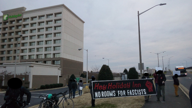 On the 4th of January, protesters showed up outside the Alexandria Holiday Inn, demanding fascists and Proud Boys be refused rooms for the upcoming coup attempt. A "credible threat" of violence caused organizers to call the event off with 1/2 hours notice, but people showed up anyway and proceeded with the protest though on a smaller scale.