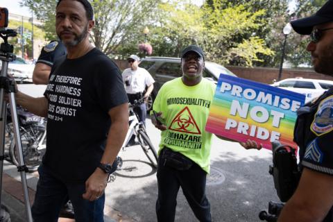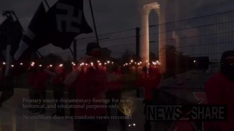 Presumed neo-Nazi at Polk County School Board meeting wearing a (probably fake) Knight's Cross of the Iron Cross with Golden Oak Leaves, Swords, and Diamonds. Note the swastika in the center of the cross, over the "1939"