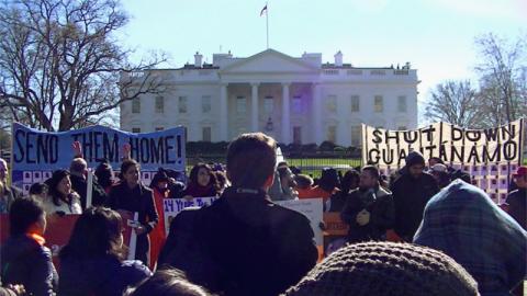 The Jan 11, 2016 protest began with a march to the White House from 4th and D sts near the Federal Courthouse. At the White House they demanded that all remaining detainees be sent home and staged a ceremony symbolizing detainees returning to their homes. Afterwards came a surprise: protesters advanced to the White House sidewalk and staged a civil disobedience. For over an hour they stood their ground in the "no-protest" area of the White House sidewalk. Due to the high political cost of arrests over Guantanimo Bay, police refused to arrest them. They finally withdrew after an hour and a quarter of protest and defiance.
