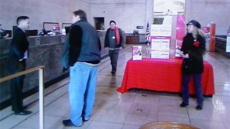 On the 21st of January, opponents of Bank of America's investments in Dominion's fracked gas export facility at Cove Point showed up at the branch across the street from the White House. Some of them were from Lusby in Calvert County, in the area an accident at the gas plant could incinerate. When one of the activists tried to deliver a letter to the bank manager, the bank refused to accept it and locked their doors in response to several more activists going inside. The bnak branch remained locked and shut down for the duration of the protest