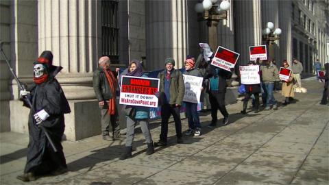 Outside, more and more activists showed up for a picket with noisemakers. These were deemed necessary since Bank of America did not seem to be listening to the people who live near Dominion's Cove Point LNG (liquified natural gas) facility. The former gas import plant is one year into a three year project to turn it into a much larger export facility for fracked gas, and running about six months behind schedule due to activist pressure and nervous financial institutions. Other bankers and investors have expressed "concern" that this facility has become a risky investment in ways other than the physical safety of those living inside the 1.8KM incineration radius of an LNG accident. As that "concern" spreads, Dominion could become the Huntingdon Life Sciences of fossil fuel production and export. Right now they have a $ 4 billion line of credit from Bank of America making possible things like the Cove Point expansion and the Atlantic Coast pipeline to feed it. If Bank of America dumps Dominion, their dreams of fracked gas export could well go belly-up. The amount of money necessary to bail out Dominion would then be at least that $4 billion, or almost 40 times as much as it cost US Bank to bail out Huntingdon Life Sciences after activists severed their $100 Million lifeline to Fortress Inc. In other words, activist should only have to kill the gas export plant once for it to stay all the day dead.