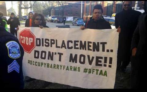 On the 19th of February, two women with a banner disrupted Mayor Bowser's ceremonial appearance at the start of demolition of part of the old St Elizebeth's psychiatric hospital. They were able to get behind the Mayor's podium and shout her down before being dragged away by dozens of men. The banner included a specific reference to "Occupy Barry Farms," another site developers and the city government are chomping at the bit to displace and gentrify. The St E's site (which is public property) is slated for replacement by a new stadium for the Washington Mystics and also to be used for practice by the Wizards. Once again, professional sports is allowed to demolish public property in DC. Upscale retail and luxury housing are also in the plans for St E's.