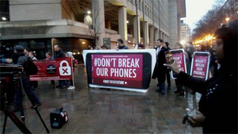 On the 23rd of February, protesters representing groups from Code Pink all the way to the CATO Institute showed up in front of the FBI's J Edgar Hoover building to protest the FBI's demands that Apple help them defeat encrypted iPhones. Speakers emphasized that this is not about one iPhone but all iPhones. Several predicted that if the FBI is sucessful those who steal credit card information would also take advantage of it. A Black Lives Matter speaker emphasized the danger that police surveillance and especially phone snooping poses to their movement. She reminded everyone of the ugly history of COOINTELPRO and racist FBI suppression of people of color. To many in this world, the FBI is not fighting terrorists, they are the terrorists.