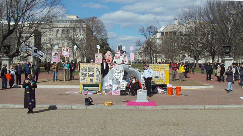 At the height of the reckless Reagan era of nuclear saber-rattling, Lafayette Square was known as "Peace Park" and was known for signs saying things like "stay the course and have a nice doomsday" plus graphic photos of the results of the nuclear bombings of Hiroshima and Nagasaki. Years of Park Police harassment never stopped the vigil, and to the Park Service's dismay it has now outlived Concepcion herself as well as Thomas, another of the original vigilers. A new generation continues their work.