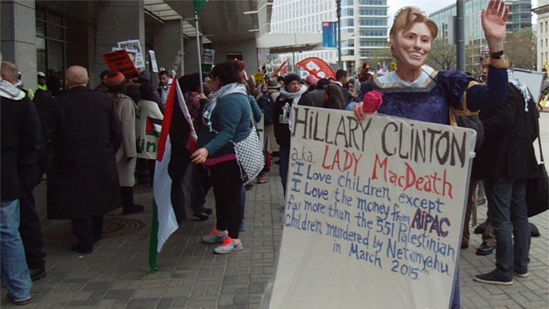 That march went through Chinatown, where it was announced that Hillery Clinton had plans to address the AIPAC delegates at the Verizon Center rather than at the Convention Center, one hour from the announcment. The person making this announcment suggested staying in that area to block AIPAC delegages from moving but was quickly overruled or ignored. The march proceeded to the Convention Center, and well over an hour later there was no evidence of any attempt to move the whole mess past this tough and determined crowd. A motorcade that could have belonged to Hillery Clinton or some other big shot did go to the Convention Center by the 7th st entrance, no evidence of one going south was seen by anyone,