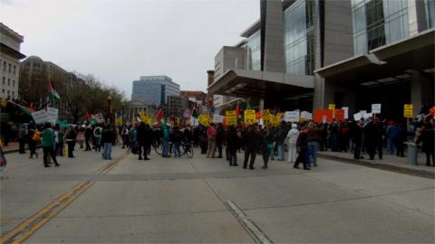 On the 20th of March, a massive crowd of protesters including many from Occupied Palestine rallied at the White House before marching in force on the Convention Center, where AIPAC was holding their convention and Hillery Clinton was due to speak. Secret Service tried to disrupt the initial rally by "closing" Penn Ave but the crowd refused to move. It was nearly an hour later that everyone finally did leave the disputed area, only to stream through the streets and confront attendees at AIPAC a few blocks away. One marcher recieved minor injuries in a confrontation with a very aggressive AIPAC attendee, but for the most part it was AIPAC that was forced onto the defensive. The protest was several times larger than the past few year's AIPAC protests and much more militant.