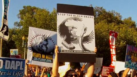 One of the speakers at the White House counterpointed the #NoDAPL slogan "water is life" by warning that "oil is death," asking what did people expect to result from literally digging up dead things (fossil fuels) and burning them in power plants and engines. Bernie Sanders also showed up to speak in person from the stage. Many of the speakers invoked the victory of Native people over the Keystone XL pipeline as the precedent for the eventual defeat of the Dakota Access pipeline. Due to the amount of money Energy Partners has already spent on construction with a speculative permit situation, that corporation will be severely damaged by a defeat of the "Black Snake" Dakota Access pipeline.