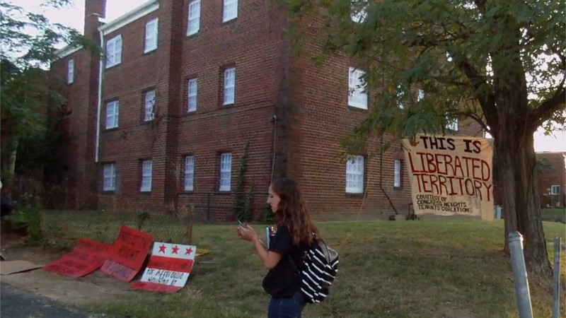 The 22nd of September was the national Renter's Day of Action, with protests in over 50 cities. In DC, tenants from Congress Heights, Museum Square, and other threatened buildings gathered on Alabama Ave by 3200 13th st. Geoff Griffis of City Partners(investor) and Sanford Capitol(landlord) plan to demolish it and the adjacent occupied buildings anyway to build luxury apartments. They are stopped at the moment by Metro refusing to put a related land sale on the agenda. The banner at 3200 13th st read "liberated territory" and police acted like they expected OneDC and Justice First! to sieze the building like what happened at Parcel 42 back in 2010.