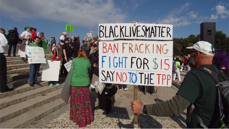 Major demands seen on multiple protest signs include stopping the TPP trade deal, stopping the Dakota Access Pipeline, a ban on fracking, raising the minimum wage to $15 an hour nationally, and universal single payer heath care. Both candidates claim to oppose the TPP, but Hillery is suspected of planning to change her mind after the election. Trump for his part is known to outsource his production at every opportunity and buy dumped Chinese steel. Thus globalization is not on the ballot. For both the Dakota Access Pipeline and fracking, Trump is an oil man who will oppose the people on both issue and may launch a military assault on Standing Rock.