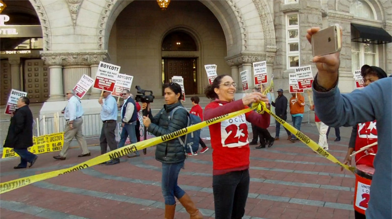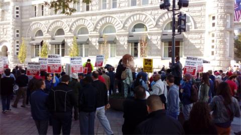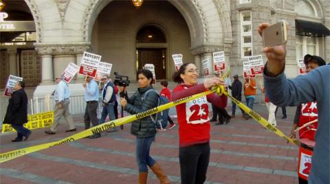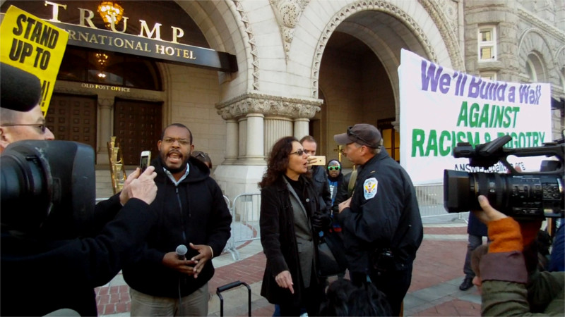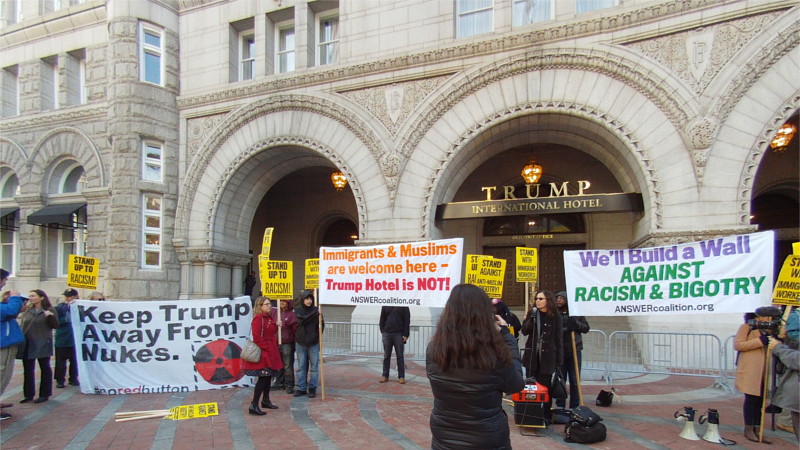 On the 26th of October, Donald Trump planned to stage a ceremonial ribbon-cutting to "open" his hotel on Penn Ave. Protesters got there first and defied police demands to shut down and move. Thus the ribbon cutting had to be held indoors while an ever-growing number of protesters from ANSWER, trade unions, Code Pink, and many more groups controlled the Plaza.
