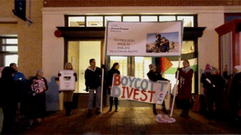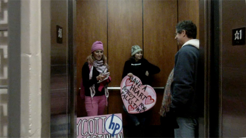 On the 28th of November, Code Pink protested Hewlett-Packard's sale of biometric and identity-tracking software to Israeli prisons, settlements, and the Israeli government in general for use at checkpoints. During the protest, someone came out the door of the building housing HP's Government Affairs office-and the open door let in several members of Code Pink, who stopped further traffic in and out by turning the elevator into occupied territory of a different kind.