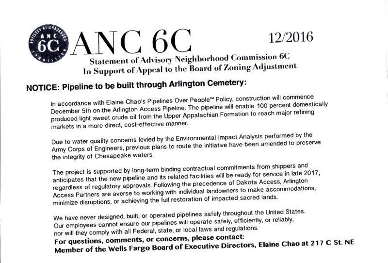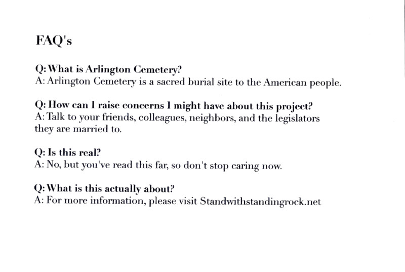 In addition to the march on Elaine Cho's home, SURJ DC distributed fliers warning of an "Arlington Access Pipeline" to be built through Arlington Cemetary following the example of the Dakota Access Pipeline desecrating comparable Native American burial grounds. The back sides of the fliers explains that the Arlington Access is fictional but that readers should be not "stop caring now" just because it is someone else's burial grounds being defiled.