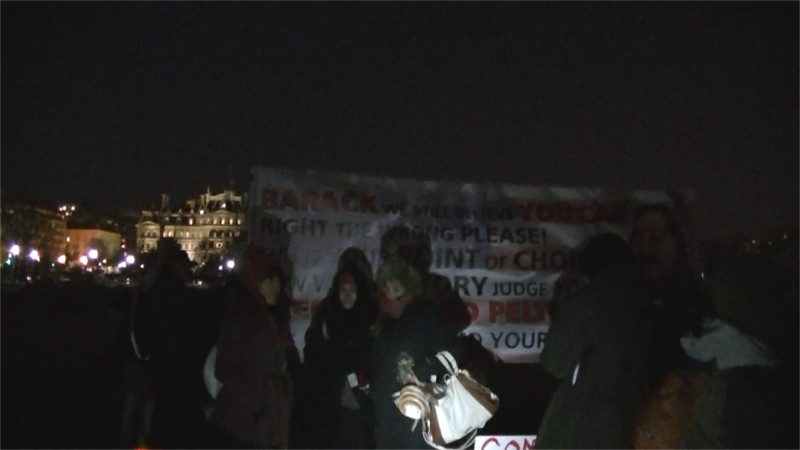 Part of the Peltier vigil set up by the National Christmas Tree while looking for the rest of the participants. They were not met with the aggressive police behavior that Code Pink and Occupy had received here in past years.