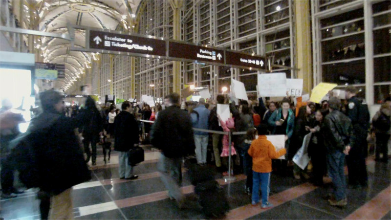 On Wed, Feb 1, as many as 1,500 protesters against Donald Trumps' (now on hold) Muslim travel ban jammed an area of Washington National Airport near an information counter. The protest began with about 600 people and grew over the following hour.