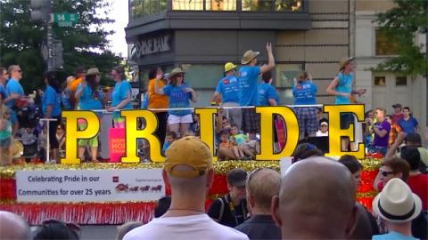 The Wells Fargo float was near the end of the parade and was very toned-down from last year, with generic "Pride" lettering and a much smaller Wells Fargo logo so they would not attract unwanted attention from those who object to Wells Fargo's investments in the GEO Group. Geo Group owns a chain of private prisons in which transgender folks face atrocious treatment, yet they are allowed to march in Pride. At least they seriously toned down their name and stagecoach imagery, to the point where I did not recognize their float until going over my video footage the next day.