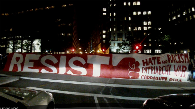 On the evening of April 27, as the People's Climate March was two days out, drummers from multiple Indigenous communities held a drum circle and round dance in front of Trump Hotel. At the climax the entire round dance took over Penn Ave in front of the hotel, blocking traffic in all 4 directions at Penn and 12th sts. The drummers and dancers were there because of Trump's executive orders ramming pipelines through Indigenous lands, and Trumps general pro-extractive agenda too.