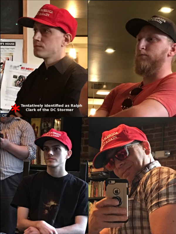On the 2nd of June, the author of the book "Against the Fascist Creep" held a discussion at the Potter's House about the history of fascism and how it relates to current events. Four neo-Nazis in MAGA hats showed up and barged in. Antifascists posted guards all around the Nazis and photographed them. Meanwhile the free speech about the history of fascism kept right on going as though the Nazis were safely in a cage at Nuremburg. One of the four openly admitted to being not just a Trump supporter but an actual Nazi.