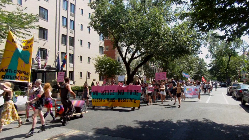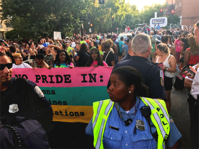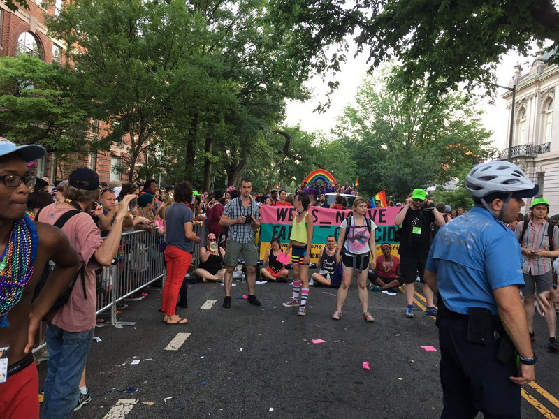 On the 10th of June, No Justice No Pride first marched over the Capitol Pride route, then used hard lockdowns to block the MPD, Lockheed-Martin, and Wells Fargo contingents. The rest of the parade rerouted around the blocked streets. MPD's contingent withdrew, unknown if they managed to get back into the parade. Wells Fargo got stuck, had to rejoin the parade at the back by the garbage trucks. Lockheed-Martin's contingent was also blocked. No reports of arrests, even at the blockades.