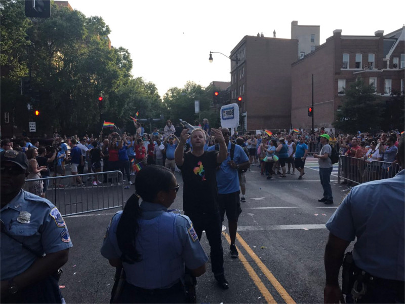 Capitol Pride sent in negotiators, and the parade rerouted around the blocked block. Eventually, the three car MPD contingent withdrew, and went south on 16th st while the parade appeared to be going north on 16th st. Later the parade had rerouted south on 16th st again. MPD appeared to have bugged out, but it's possible they rejoined the parade elsewhere.