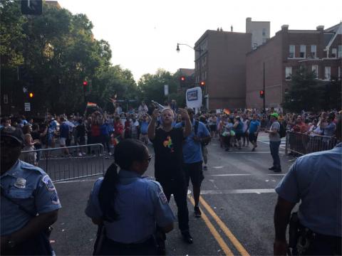 As the MPD contingent approached the blockade zone, only a few obvious participants were visible in the crowd of "spectators." A couple contingents ahead of them was DC Black Pride, blockaders could have marched in with them, then blended with spectators, or just been dispersed throughout the dense crowd until the moment arrived. MPD seemed to have overshot the blockade site, then suddenly a surprisingly large number of people swarmed into the street ahead of them. Cables were strung across the streets and protesters locked into them.