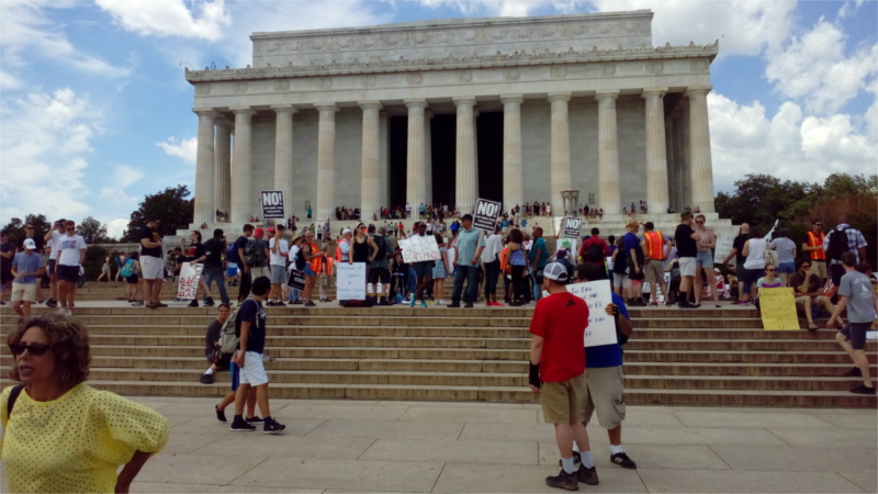 The main fascist rally at the Lincoln Memorial included Richard Spencer, and it was splits between him and the rapey/"alt-light" set that drove some of the fascists to stage a splinter rally at the White House. There were a fair amount of "dueling chants" between the ISO and DC United Against Hate counterprotest on the high ground (Lincoln Memorial steps) and the fascists on the low ground(by the reflecting pool), but neither side tried to breach the lightly-manned double wall of bike-rack fence to attack the other. When Richard Spencer wrapped up his long-winded racist speech, fascists set off green smoke flares around their banner. The smoke was thick and irritating to the lungs, and a mainstream journalist was reported as joking "they're releasing the Zyklon." This was in reponse to journalists having to move after being gassed out of their previous position by the smoke. After all, gassing people is one of the acts the Nazis are best known for-over 6 million Jews and countless others died in their gas chambers during WWII.