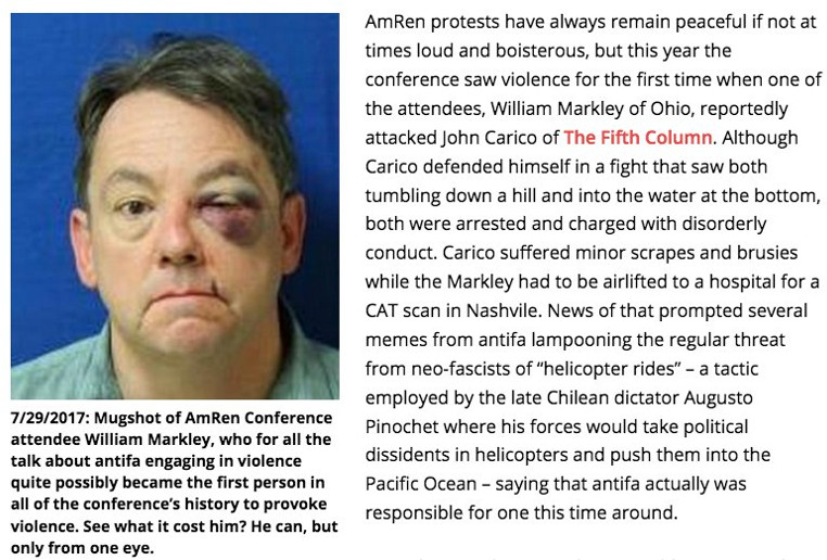 DC Activist Lacy MacAuley posted a photo to https://twitter.com/lacymacauley showing the car that tried to run her down along with other photos of the overall event and many details. In particular she reported that one of her friends was tasered and pushed down a hill by Willam Markley, an attendee at AMREN, both of them then ending up in the lake. She also reported the helicopter ride to the hospital taken by Markley for a CAT scan, pointing out that right-wingers have threatened Antifa with "free helicopter rides" in the past but it is anti-fascists who have actually succeeded in giving a Nazi a free helicopter ride. That ride did not include though being thrown out the helicopter's door as "DC Anticom" advocates and Pinochet used to do, however. Air rescue pilots and medics are simply not into that sort of thing.