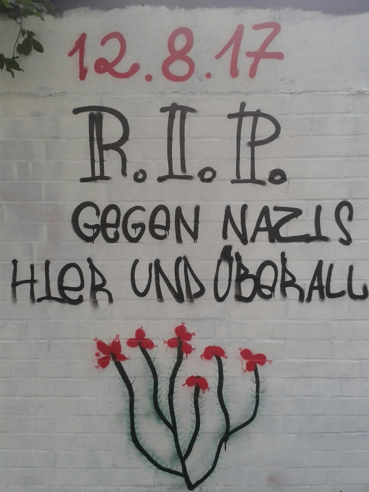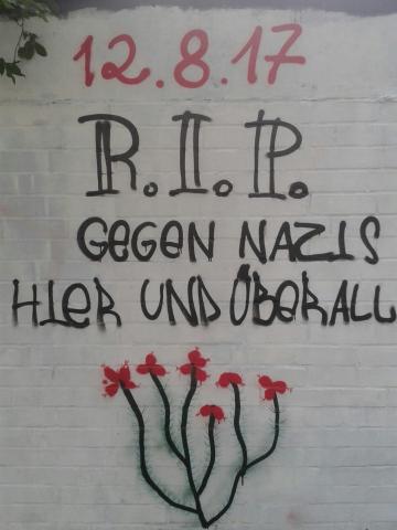After learning about yesterdays (2017/08/12) attack against a anti-fascist ralley in Charlottesville, Virginia, we got grief but also rage. That feeling led us to make a graffito in Dortmund, a place which counts several victims of neo-nazi attacks (incl. 5 murdered in the last 20 years).Yesterday in Charlottesville (Virginia) a (supposed) Nazi drove his car into a crowd of people, who were ralleying agains a facist march. Dozens got injured. Among the victims was also Heather Heyer, a paralegal. She died on the scene. She was 32 years old.For quite some time we observe the spiral of violence being accelerated upwards in the U.S. One of the key organizers of the march, Richard Spencer, just after last years election yelled Hail Trump during one of their gatherings in Washington (DC) to celebrate Trumps electoral victory, responded by arms raised in the audience. Since then, and even before, they feel gaining momentum. The decision of local authorities of Charlottesville to remove a confederate statue and rename a park was an attractive reason for various factions of radical right wingers (NSM, National Front, KKK, alt-right, etc.) to call for "unification".The actual call to protect the memorial statue of a long time ago deceased confederate general, who was supporting slaveownership during the civil war, and to even bring arms to the march in Charlottesville tells us only one thing: it unmasks the fascist longing for death. To protect an inanimate object, which is claimed to represent an infamous dead person, who was militarily supporting fatal slavery could only mean one thing to a somewhat 20year old guy: to get into his car and to use it as a deadly force against an indiscriminate crowd.It has hit only one. But all of us are meant.Antifa Global!anti-fascist individuals, 13.08.2017