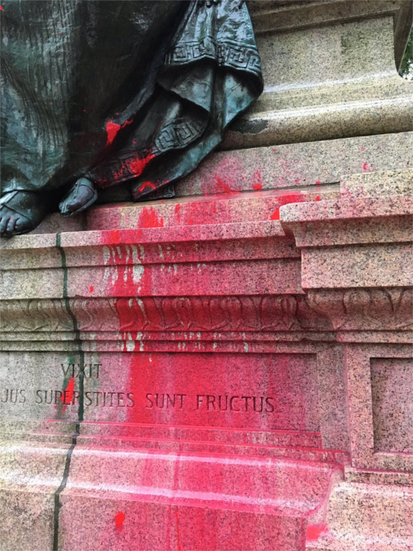 Bad day for Albert Pike statue by MPD: Banner drop, rally and red paint