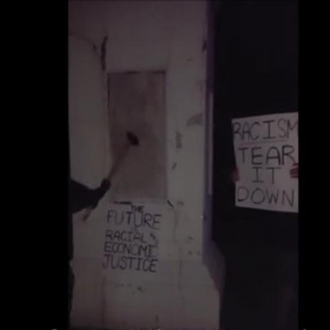 The video shows an individual explaining why he is destroying the plaque commemorating Columbus. He says: