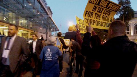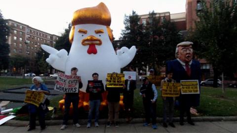 Trump tax cut speech for Heritage Foundation draws protest, "Tax Chicken"