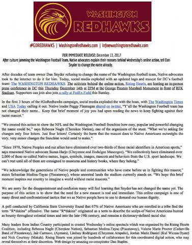 Rising Hearts hoaxes Washington Football Team with name change to Redhawks