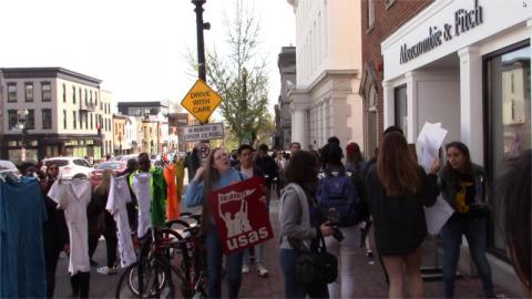 Physical assault, blackllist, and even sexual assault have been used by the garment bosses in Bangladesh to discourage workers from joining unions. Under this kind of attack, it is critical that supporters in consuming countries such as the US target retailers selling clothes made in such conditions, essentially a "demand reduction" strategy. Nobody should be able to buy clothing made in factories that are waiting to crumble or burn, or where workers face sexual assault for joining a union without having to consciously cross a picket line. A few shoppers at "Abercrumble and Ditch" in Georgetown on April 21 did exactly that, but far more people passed by without shopping there. The place did not look very busy except for police arresting an African-American man they dragged out of the store for an unknown reason not related to the protest.