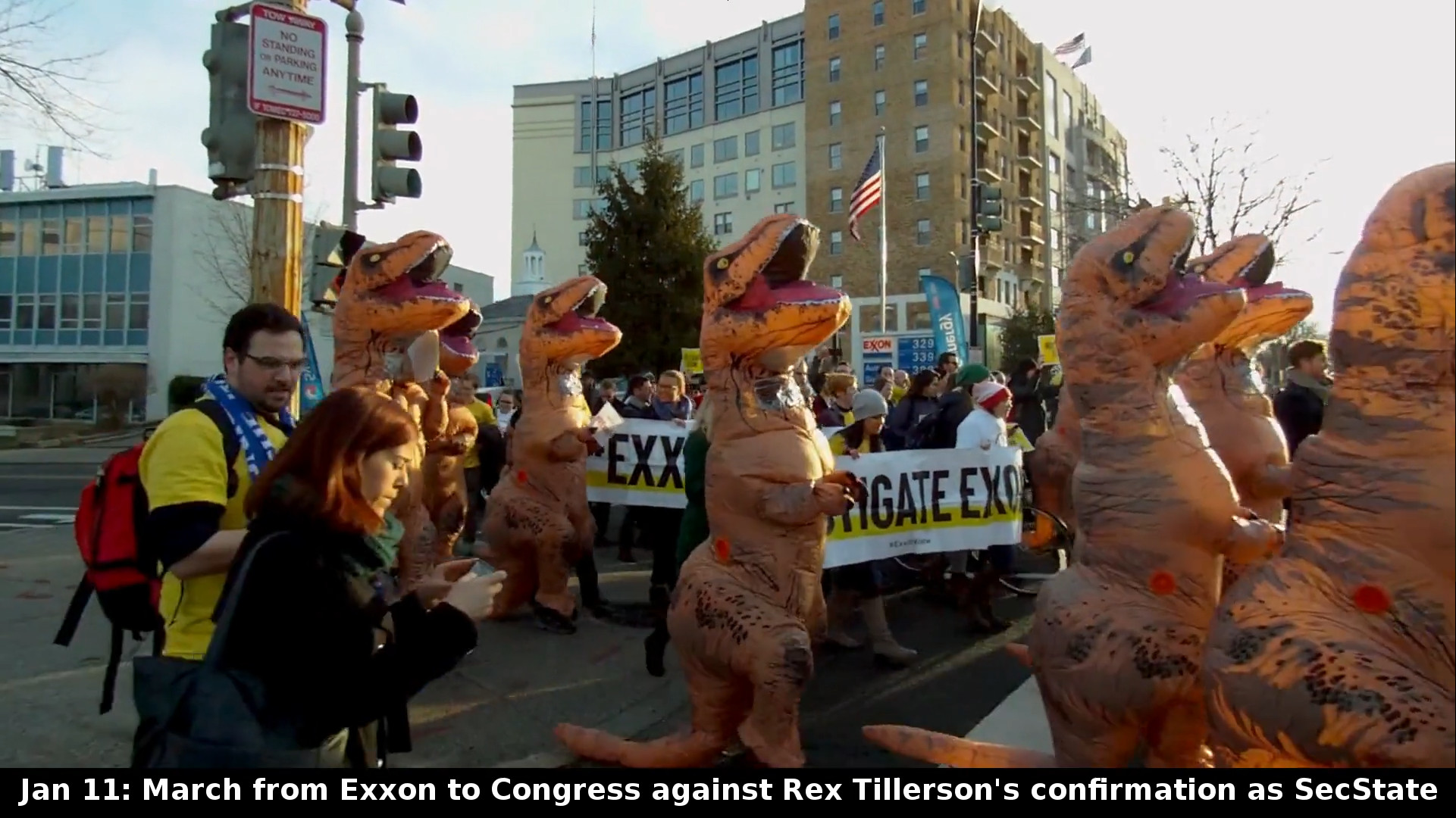 Some of the T-Rexes have really been around the block since then, showing up in the 2017 Science March and later protests. Now one of them is seen at Occupy Lafayette Park. Interestingly, Rex Tillerson (the man in whose dishonor they were made) himself had significant illegal ties to Russia, just like Trump. He was fired in March 2018 as Secretary of State, but not before his name came up in an investigation of Exxon's violation of sanctions imposed on Russia by the Obama administration.