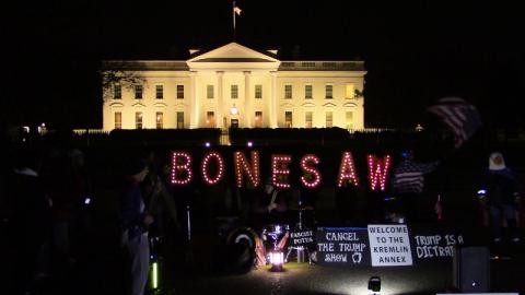 Nov 19 was the 127th evening in a row of the #KremlinAnnex protests outside the White House demanding that Trump be impeached or removed as unfit for office. On Nov 19th the lighted sign behind the protest read "BONESAW" as protesters hammered Donald Trump for refusing to listen to tapes of Jemal Khashoggi's murder and refused to listen to evidence from his own CIA that the Saudi crown prince ordered the murder.