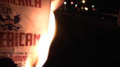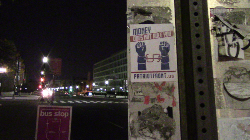 On the 7th of December, members of the neo-Nazi "Patriot Front" posted several stickers on the backs of street signs in DC, then published deceptive close-up photos on Gab.ai making them look much larger. The next day Patriot Front held an unannounced march in DC. That night, DC activist Luke Kuhn followed the Gab posts to the offensive stickers, ripped them down, and burned the one that came down in large enough pieces.