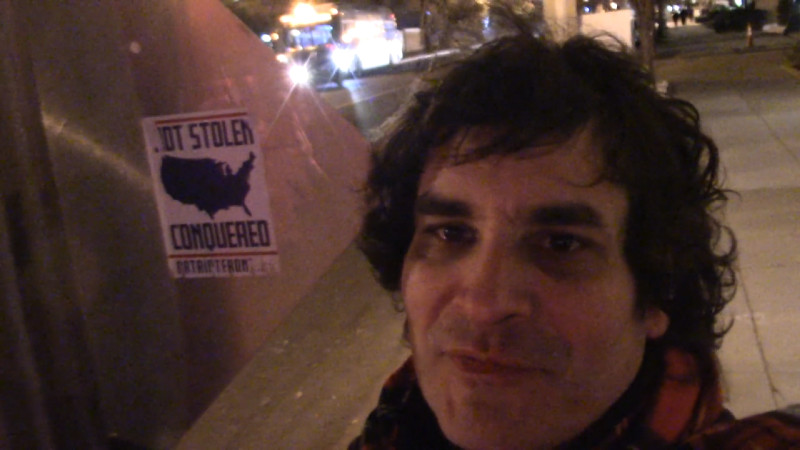 The worst of the Patriot Front trash shows the outline of the portion of Turtle Island claimed by the so-called "United States" and claims "not stolen conquered." If the member of Patriot Front who marched in DC during the day had stayed for the evening only to have their cars or their wallets "conquered" by local residents, they might choose to accept that conquest and theft are the exact same thing.