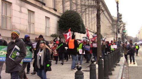 Near the start of the march, a feeder march of union activists opposing the government shutdown marched from the White House to Freedom Plaza to join forces with the Women's March. Many of them appeared to be in the lead contingent when the march stepped off