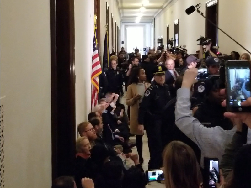 On the 23ed of January, Trump's "government shutdown" began to fall into chaos. As the government prepared to miss a second paycheck Federal workers swarmed the Hart building chanting "No more food banks we want a paycheck!" Some went on to occupy Senator Mitch McConnel's office, leading to 12 arrests.