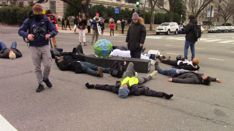On the 26th of January, the Extinction Rebellion marched a casket from Pershing Park to the Smithsonian Museum of Natural History to memorialize the many species which have been made extinct by human activity. At the conclusion of a funeral service for human-extincted species at the musuem, activsts marched off and blocked the intersection of 9th st (395 entrance) and Constitution Ave. No arrests resulted.