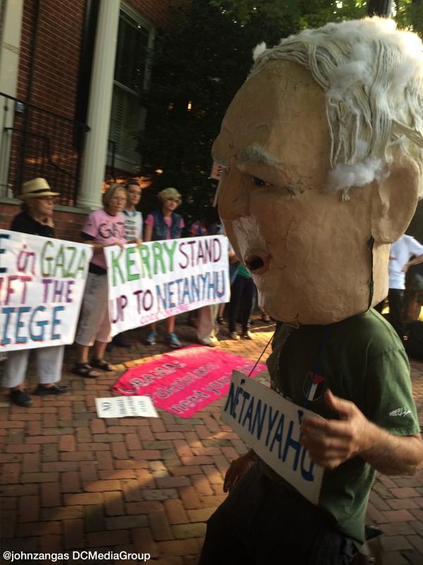 Code Pink even deployed a Nehatanyu version of their famous paper-mache wearable street puppets in front of Kerry's home as part of their street theater to demand an end to US collaboration in Israel's latest war on Palestinians. Nehatanyu was protrayed as not being happy unless all Palestinian land is owned by Israel. Later, the protesters marched through Georgetown chanting "Free, free Palestine and other chants to educate Georgetown's rich and powerful