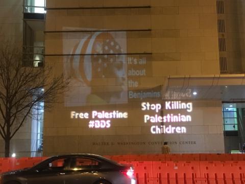 Shortly after sunset, a light projection against AIPAC on the walls of the convention center took place without incident. There were concerns that the projector crew would face arrest like the recent incident at the US Capitol or would be assaulted by the JDL(Kahanists) but neither one took place. Perhaps for JDL to assault pro-Palestine protestrs after refusing to take on Holocaust deniers would have been too much hypocrisy even for them?